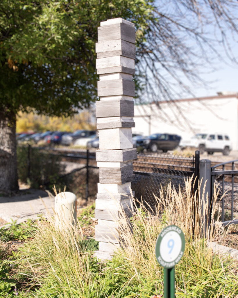 “When given the opportunity to embark on this community project I was honored. Community is very important to me. I love that we are a vibrant, forward thinking people that also honor the past. My piece honors the past also. It is made of scraps and recycled barn wood that dates back to 1927 (from right here in Moorhead). My hope is that people will lovingly leave notes for each other or inscriptions on or in-between the layers of wood. The piece will weather and change over time, just like us. My hope is that it may provide someone with inspiration and that the project as a whole will bring us all closer to our home and our community.”