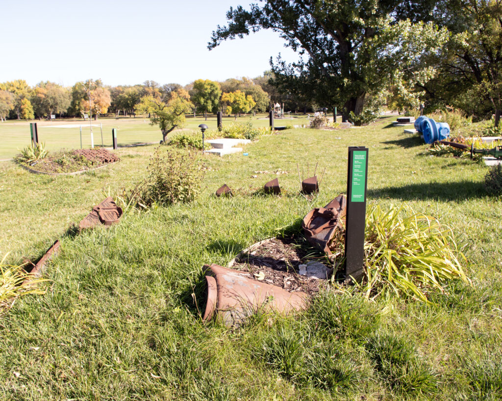 Designed by artists Su Legatt, Rob Fischer, and Kevin Johnson, the Heritage Garden & Amphitheater is located near the site of the decommissioned power plant along the Red River and adjacent to Woodlawn Park. The power plant provided power to Moorhead from 1896 until 2014, and was a central element to the Woodlawn Park neighborhood. The artists’ plan has created an environment that serves as an homage to the power plant, the history of the neighborhood and its residents. Elements from the power plant are incorporated into landforms and garden beds, and serve as found sculptures. Residents from the neighborhood have contributed plants and their personal stories.